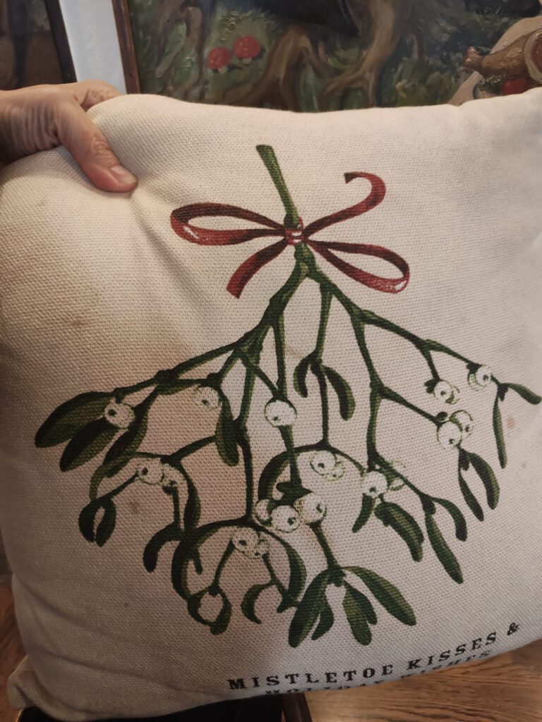 Oblaci su se razbježali, a mi smo platili račun i digli se od stola. Tek tada vidjel sam da sam sjedila na jastuku koji prikazuje imelu.