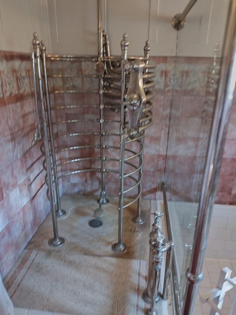 Poseno su impresivne kupaonice koje imaju ogromne kade u koje su ulazi na stepenice prema dolje, kao svojevrsni bazeni te nekadašnje tuševe koje su meni ostavili malo čudan okus u ustima. Ne volim starinske tuševe, metalne cijevi. Sve puno metalnih cijevi na kojima su skakave kemijske oznake… Dječje sobice sa starinskim krevetićima također podsjećaju malo na bolnicu, ali izlozi sa garderobom, cipelama i nakitom od vlasnice odmah vas vrate u sjajne dane dvorca.